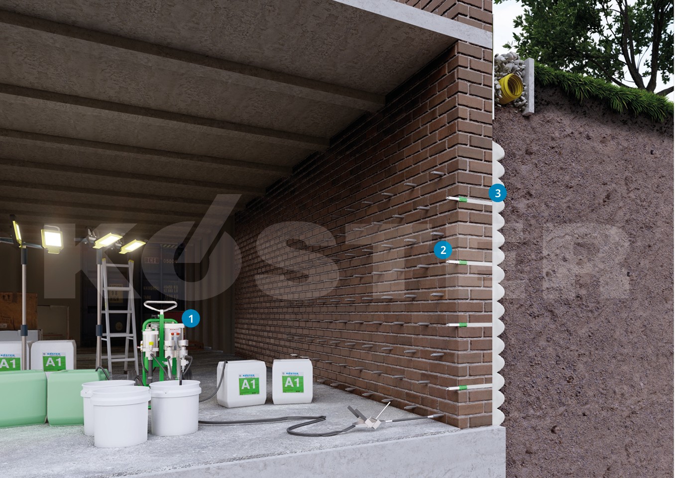 U tom slučaju moguća je izvedba vodonepropusne gel-zavjese sa materijalom KÖSTER Injekcijski Gel G4: smola se sa unutarnje strane objekta pumpom injektira kroz konstrukciju na vanjsku stranu zidova. Smola reagira u dodiru s vodom, veže i pretvara se u vodonepropusnu, elastičnu masu (zavjesu). Injektiranje se izvodi uz pomoć specijalne dvokomponentne pumpe - KÖSTER Pumpa za akrilni gel - kroz patentirani sustav pakera. Zainjektirani materijal se ravnomjerno raspršuje uz stijenke vanjskih zidova te u kratkom roku pretvara u hidroizolacijski sloj.